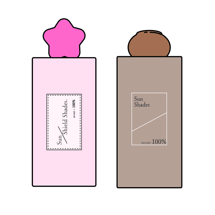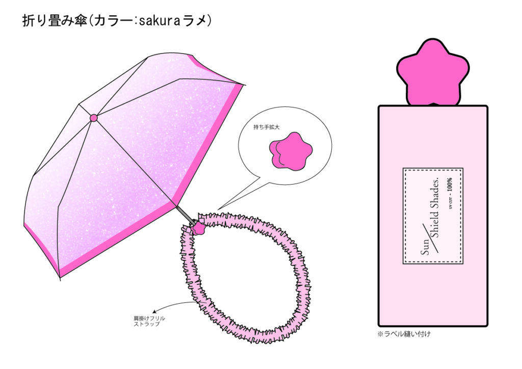 sakuraラメのロゴは、韓国っぽいラベルを意識して「Sun Shield Shades.」「UV CUT-100%」を配置し、日光を遮断し影に隠れるイメージから