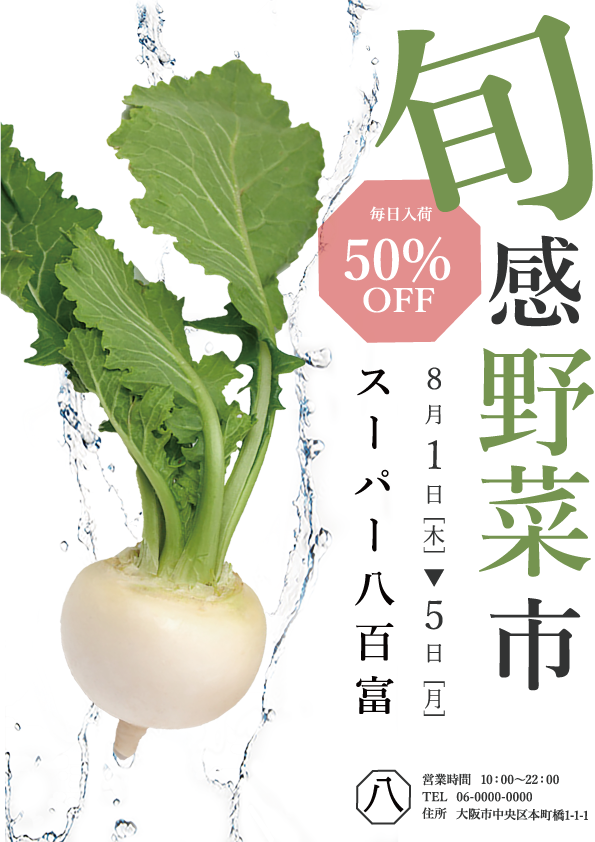 上質な商品を展開するワンランク上のスーパー「スーパー八百富」の野菜50%offセールの告知をしてほしい。