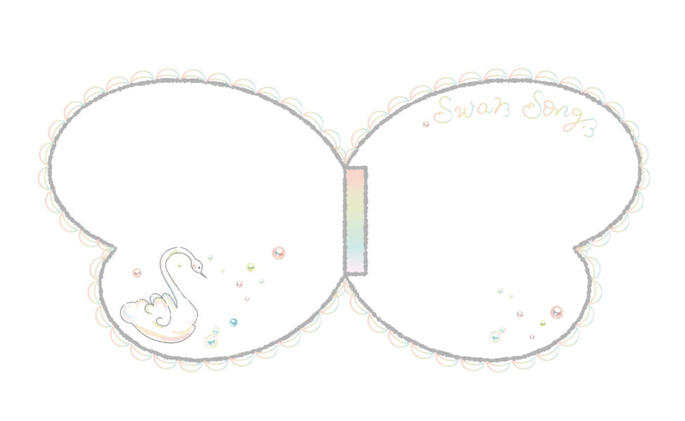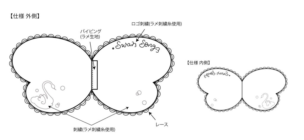 羽形のハンカチは円を元に、ダイレクト選択ツールで作りました。周囲のレースは半月の図形をパターンブラシに登録し、一回り大きいハンカチの図形の線に適用し、ダイレクト選択ツールで調節しながらハンカチに沿わせました。
